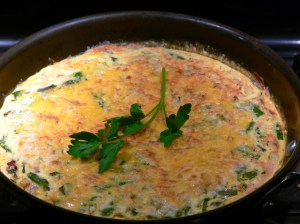 I’m making a frittata, and the surprising ingredient, one that I found growing in our garden when we moved here nine years ago, is asparagus. Last year I gave you a yummy Asian-inspired asparagus soup, and now I present an equally delicious asparagus frittata. You can serve this for breakfast — it’s quick, easy and beautifully presentable, and it’s nutritious as can be — or you can serve it as a complete dinner. We call it “breakfast for dinner,” which we do every couple of weeks. Serve it with smashed, roasted, salt-and-vinegar red potatoes, the recipe for which I will place on my blog, TalkingFresh.typepad.com, along with another frittata recipe that’s worth a look.