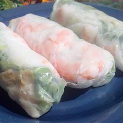 - To assemble the rolls, dip 1 rice wrapper in a large bowl of room temperature water for a few seconds to soften. Place wrapper on a work surface and top with 4 shrimp halves, 1/4 of the chopped lettuce, 1/2 ounce vermicelli, and 1/4 each of the mint, cilantro, and Thai basil. Fold right and left edges of the wrapper over the ends of the filling and roll up the spring roll. Repeat with remaining wrappers and ingredients. Cut each roll in half and serve with dipping sauce.