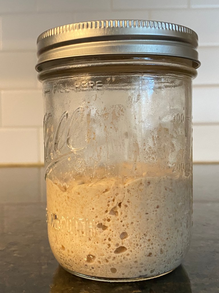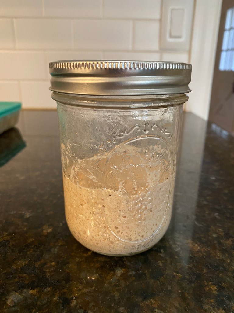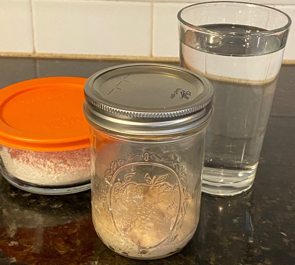 So here’s the scoop: The Pressured Prepper says to combine three tablespoons of flour—he suggests a mix of bread and whole wheat flours, and a bit of rye flour if you have it on hand— with two tablespoons of dechlorinated water, and mix well in a pint-size canning jar, cover and set it on the counter at room temperature (dechlorinated water is just really tap water that has sat overnight in an open container, so that the chlorine gas evaporates). The mix of flour—it doesn’t want any all-purpose flour—provides the starter additional capabilities for capturing wild yeasts that are in the air. The Prepper goes on to say that you can speed up the process by using pineapple juice instead of water, and adding just a pinch of active dry yeast.