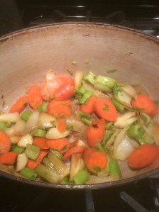 2. Halve then onion, cut 1 inch from the top of the carrots, and remove 1 inch of the celery from the root end (shave off the brown end). Place them all, cut side down, in the hot oil and cook, unmoved, until they begin to brown.