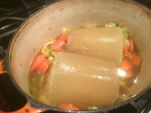 Okay, this one’s easy, it’s really good and hearty, and it’s made from found stuff in the fridge, freezer, or cupboards. I should point out that the base of this is a stock that I made back at Thanksgiving. On Black Friday, when the fam all headed out at 5 am to the outlets I a) slept in; and b) threw the turkey bones, and other leavings in a pot with lots of water, an onion, a celery stalk, a carrot, and some garlic. I do this every year—you should, too (I also do that with all my vegetable peelings and scraps to make a veggie stock). I simmer the stocks until four quarts of water are reduced to two, then pour the strained stock into Chinese-restaurant soup containers and freeze them. So I always have “no-sodium stock on hand when the need arises.