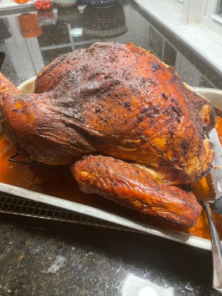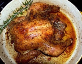 Then follow the directions as in the earlier post—which I’ll repeat here because it takes only a few words. Preheat the oven AND A HEAVY 12-INCH OVEN-SAFE FRY PAN—an enamel pan is best, but a cast-iron pan works too—to 450 degrees. Carefully take the pan out of the oven, place the whole bird in the pan, and return the pan to the oven. Set the timer for 30-45 minutes (depending on the size of the bird). When the timer goes off, turn the oven off and set the timer for the same amount of time again. DO NOT OPEN THE OVEN DOOR!!! When the timer goes of this time, take the pan out of the oven, set it on the counter, cover the bird with foil, and set the timer for 15 minutes. Then carve and enjoy.