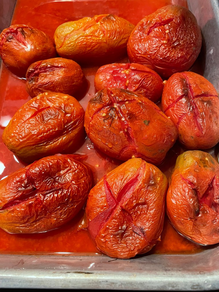 In my admittedly unscientific experiment, my San Marzano plant gave me a surprise: nearly four times the number of tomatoes, and of such amazing size that some of them were as large as my fist. So far, as of October 1 I have harvested and roasted more than 30 pounds of these wonderful tomatoes–twice what any of my other plants produced. And that is cooked weight–I roast, peel, and freeze my tomatoes, so that I have them to use all winter–tomatoes from my garden in February is a special treat, especially when they are these amazing San Marzano-variety tomatoes. Just today I roasted up four pounds (cooked weight) and I’ve been doing this every weekend since they first started to ripen more than a month ago.