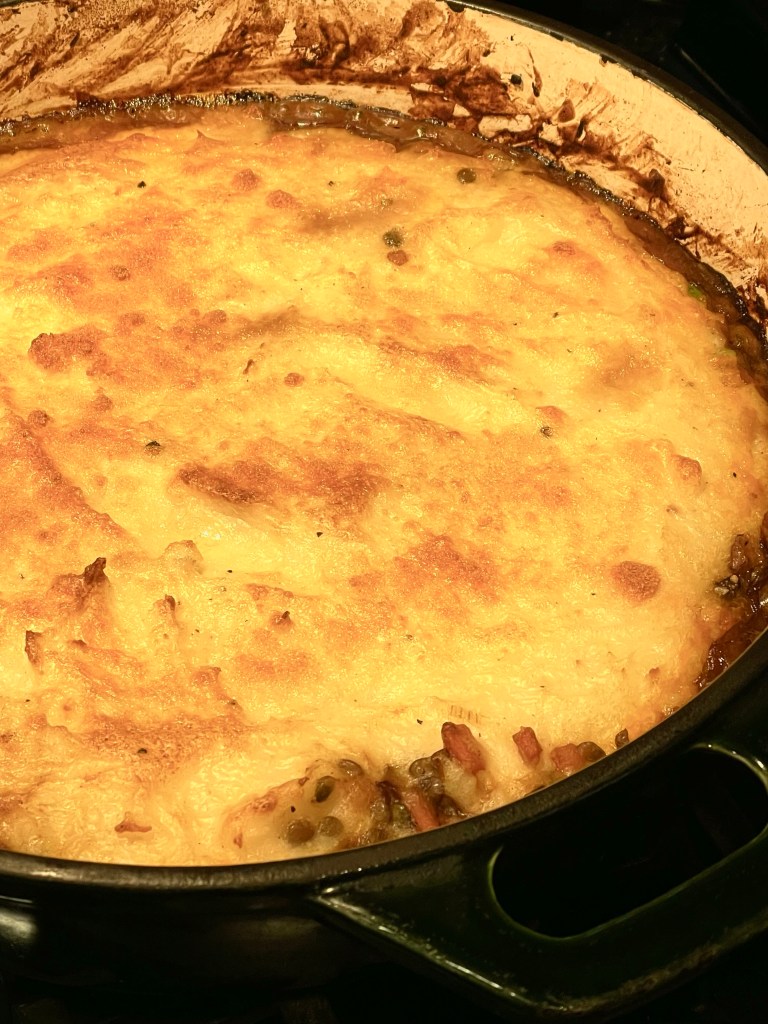 - Top the mixture with dollops of the mashed potatoes, then spread them out over the top. (Or transfer the lentil mixture to a 3-quart casserole dish and spread into an even layer, and top with potatoes.) Sprinkle with the remaining Parmigiano. Transfer to the oven and, if the mixture is at the top edges of your pan, set a foil-lined baking sheet underneath the pan to catch any drips. Bake the pie until the potatoes have begun to brown and the edges are bubbling, about 30 minutes, then 3-5 minutes under a low broiler, until the potatoes begin to brown. Let stand at room temperature for 15 minutes before serving.