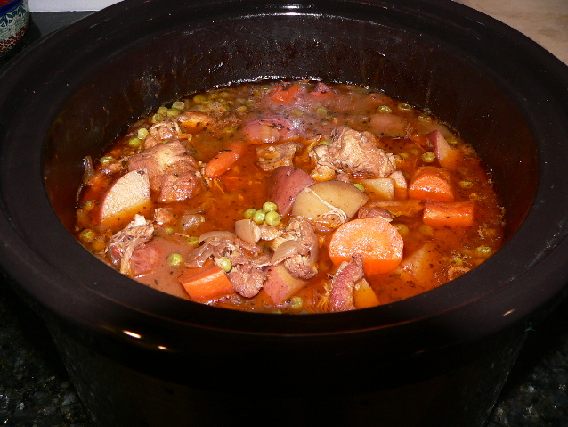 Add the onions, carrots, potatoes and remaining wine. Add salt and pepper to taste. Simmer for an additional hour, adding the peas in the last 15 minutes. Serve when the potatoes are tender.