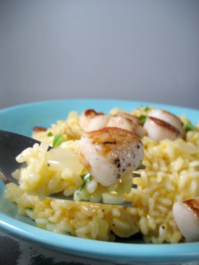 Serve the scallops over the rice or risotto and drizzle with the pan sauce. Garnish with chopped chives.