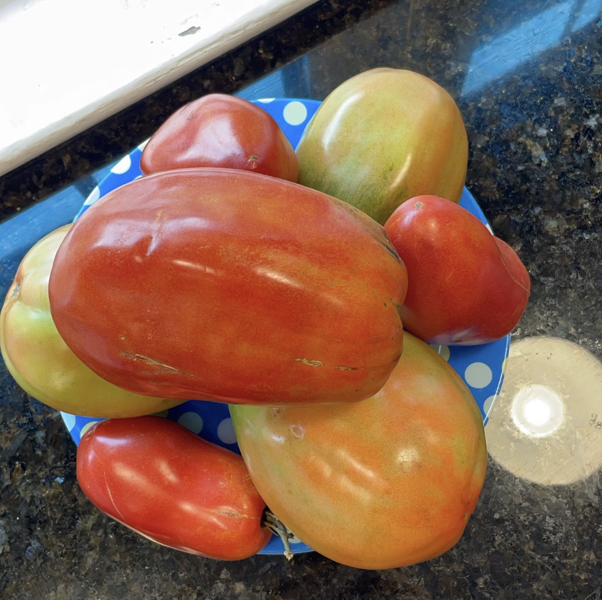 2. Preheat the oven to 450 degrees; wash the tomatoes, cut them in half (quarters if they are large), lay them out on a baking sheet or two, lay the basil branches over the tomatoes, spray with a bit of olive oil spray, and roast for 15 minutes. Remove from the oven and allow to cool to “handling” temperature.